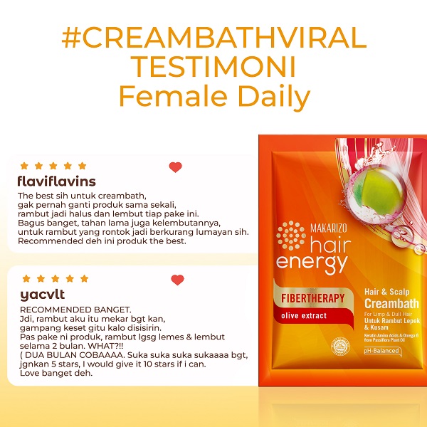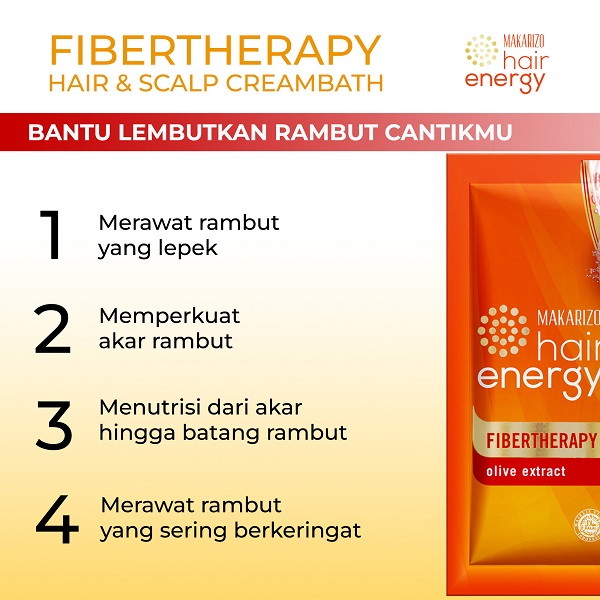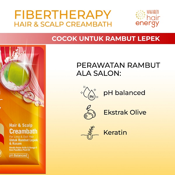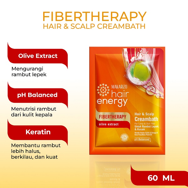 - Makarizo Hair Energy Fibertherapy Hair & Scalp Creambath hadir dengan kombinasi Omega 6 dari Minyak Nabati Passiflora dan Olive Extract dengan kandungan alami Vitamin A & E, sehingga dapat membantu menjaga lapisan keratin serta mengunci kelembaban rambut dan mengurangi kelepekan pada rambut, rambut akan lebih bersinar, lembut, dan bervolume!