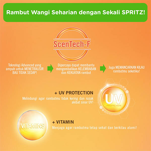 - Parfum dengan formula ScenTech-F yang dapat menetralisir bau tidak sedap pada rambut dan badan serta dilengkapi dengan vitamin dan UV Protection.