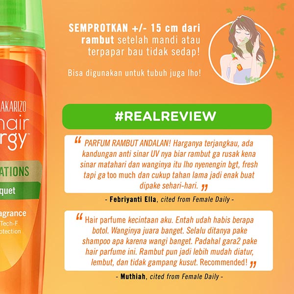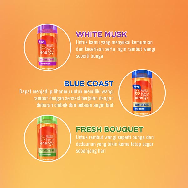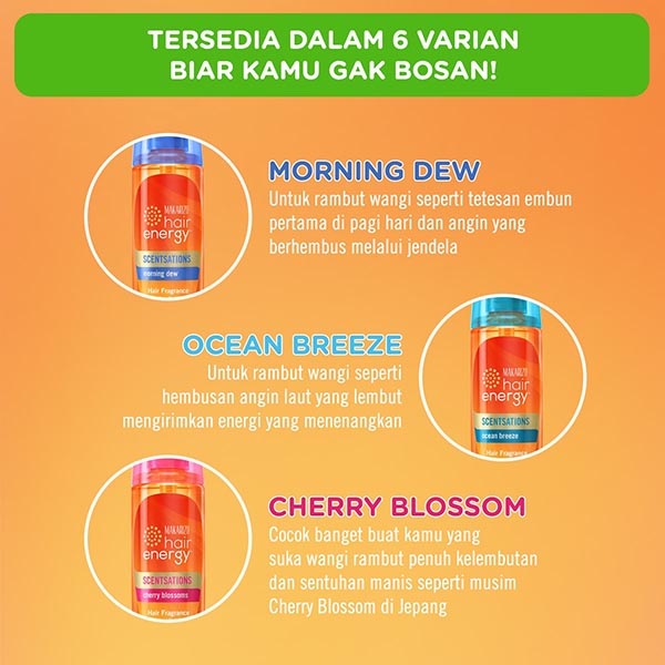 - Parfum rambut 2in1 Hair and Body yang membuat kamu tetap wangi dan segar. Gak cuma untuk rambut, Makarizo Hair Energy Scentsation juga bisa digunakan untuk badan, baju, dan hijab lho.