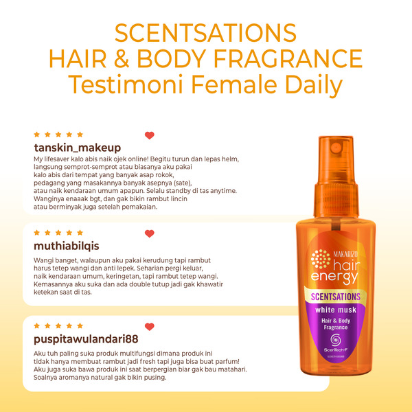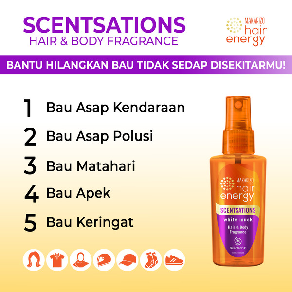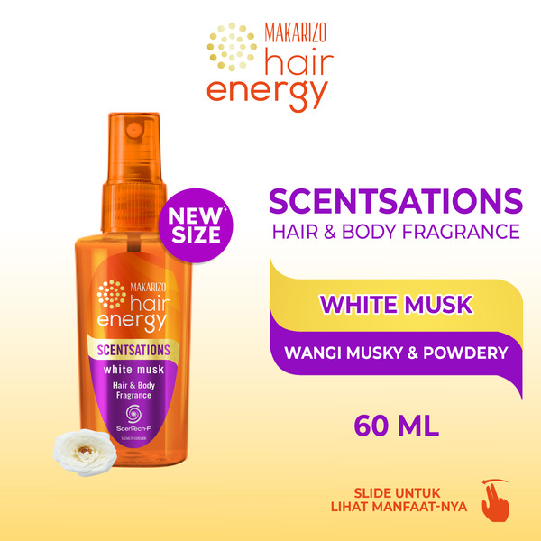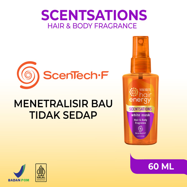 • Parfum rambut 2in1 Hair and Body yang membuat kamu tetap wangi dan segar. Gak cuma untuk rambut, Makarizo Hair Energy Scentsation juga bisa digunakan untuk badan, baju, dan hijab lho.