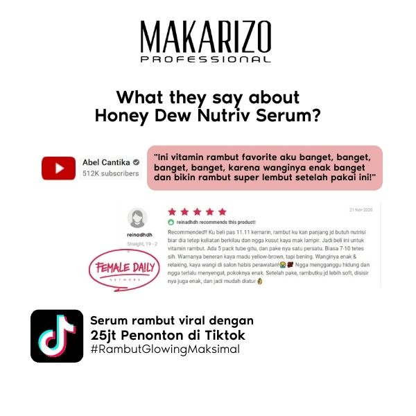 Honey Dew Nutriv Serum diformulasikan khusus dengan vitamin A, C, dan E untuk melembapkan dan menutrisi rambut. Dengan kandungan madu dan silikon yang berfungsi untuk: